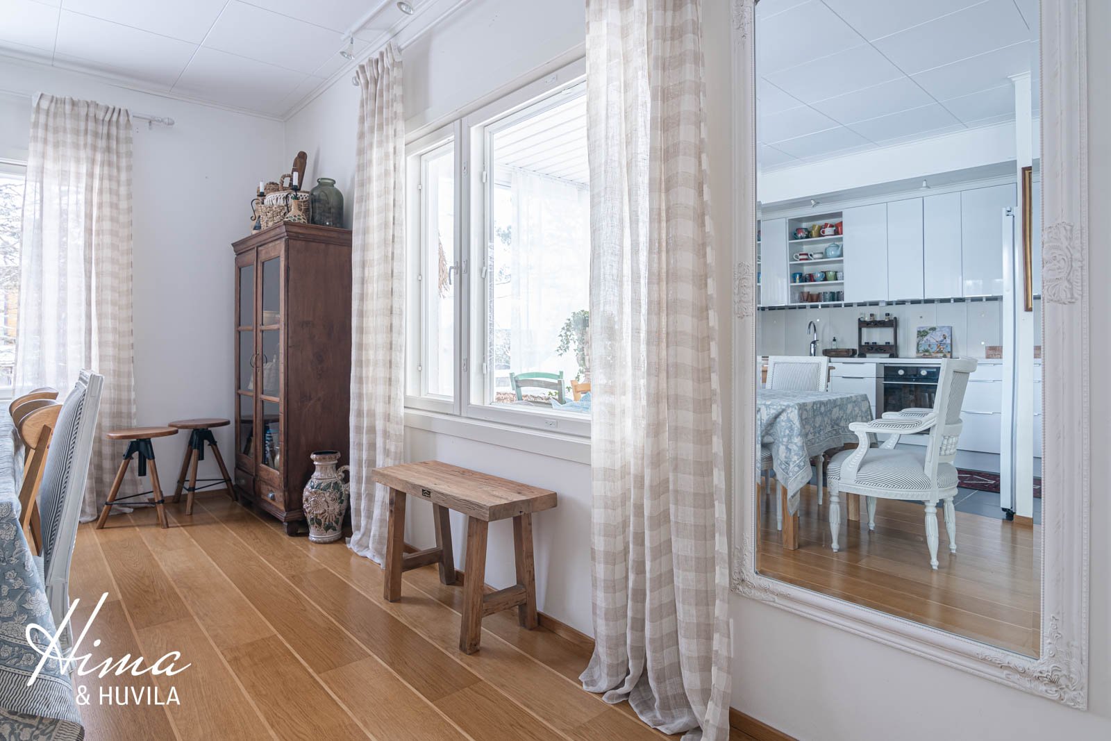 Olohuone ja ruokailutila muodostavat valoisan ja avaran kokonaisuuden, josta on näkymät punaisten kalavajojen yli suoraan merelle ja Länsisatamaan. Täällä voit istuskella ja tarkkailla Hankoon saapuva ja lähteviä laivoja. Merellistä vaikutelmaa korostaa upea laivankansityylinen parketti, joka jatkuu läpi alakerran. Olohuoneessa on myös varaava takka ja käynti lasipariovista ihanalle lasitetulle terassille. Siellä viihdytäänkin jo varhain keväällä, sillä terassi on suoran etelään. Seinät maalattu. |
