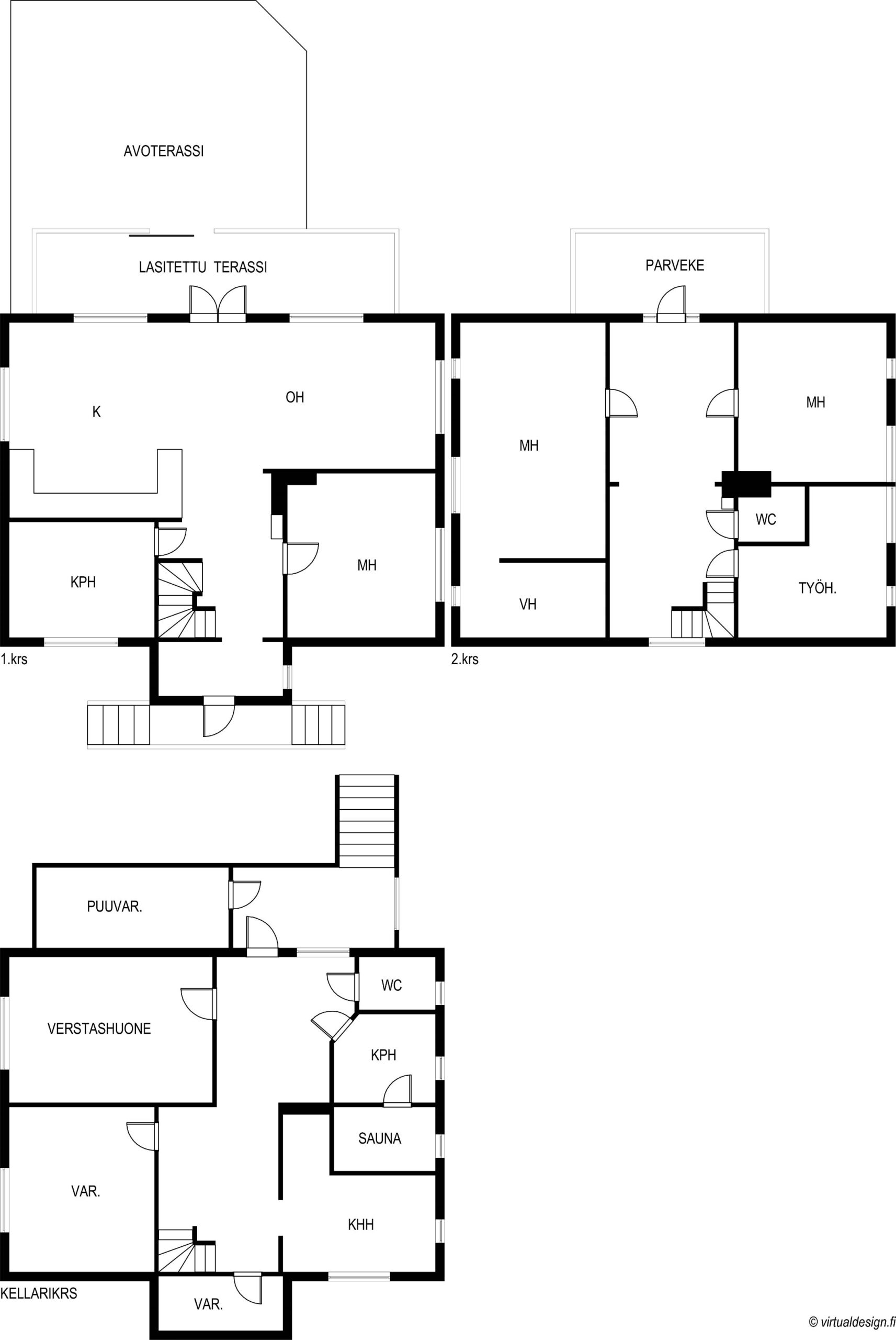1. kerroksen kylpyhuone on valoisa ja avara. Kääntyvät suihkuseinät ja tilava allaskaapisto. Wc-istuin. Koneellinen poistoilmatuuletin. Lattia laattaa, seinät kaakelia. Toinen kylpyhuone saunaosaston yhteydessä. Lattia laattaa, seinät kaakelia. |