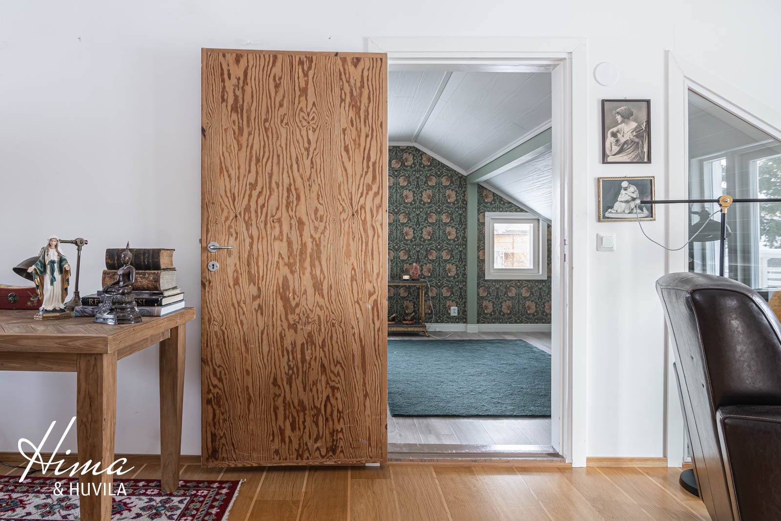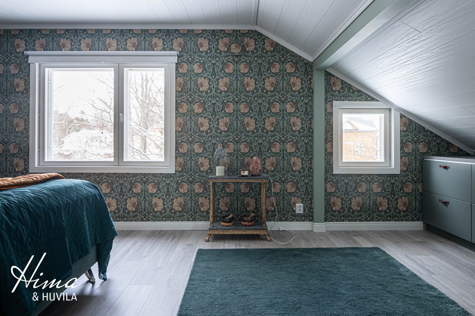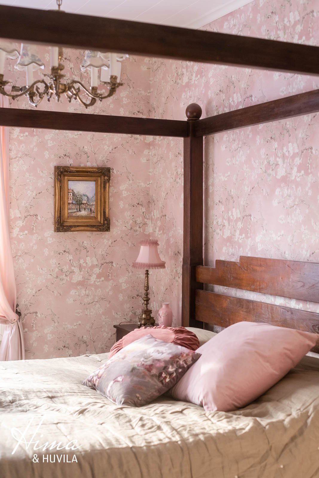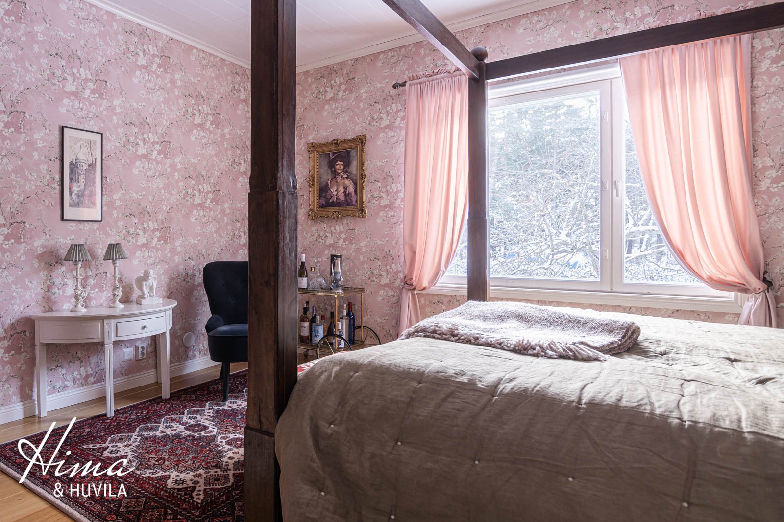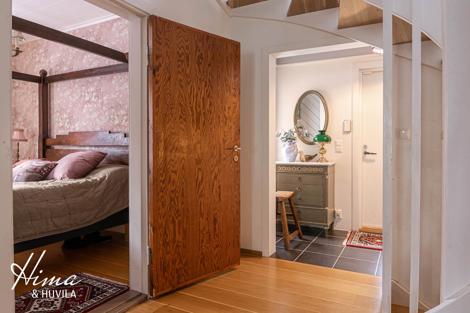 Alakerrassa on yksi romanttisen roosanväriseksi remontoitu makuuhuone ja yläkerrassa kaksi pienempää huonetta sekä komea päämakuuhuone, jonka seiniä koristaa Morris & co:n upea tapetti. Päämakuuhuoneen vinokattojen alle on teetetty mittojen mukaan tyylikkäät säilytyslipastot nahkavetimillä. Lattiat parkettia, seinät maali/tapetti. |