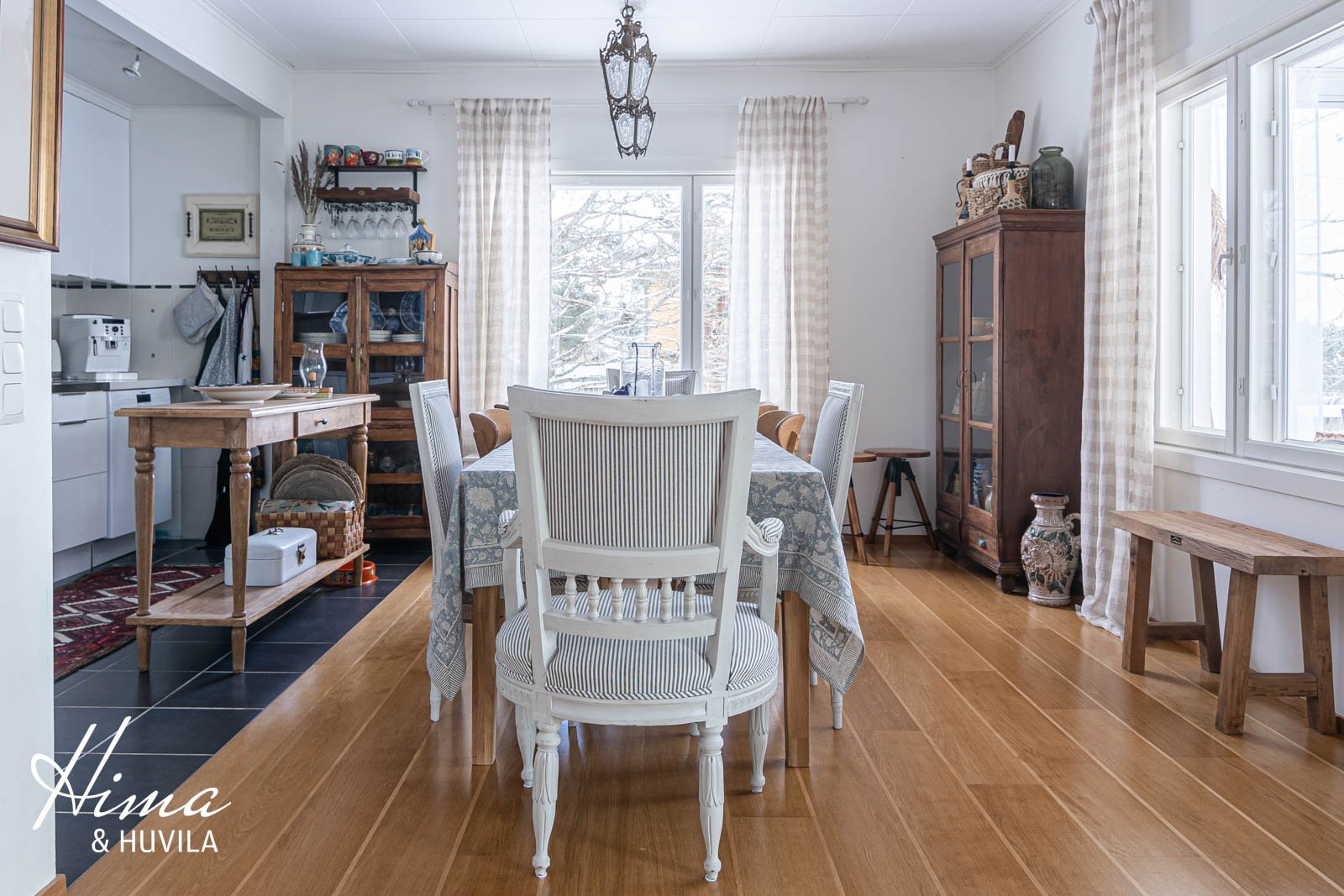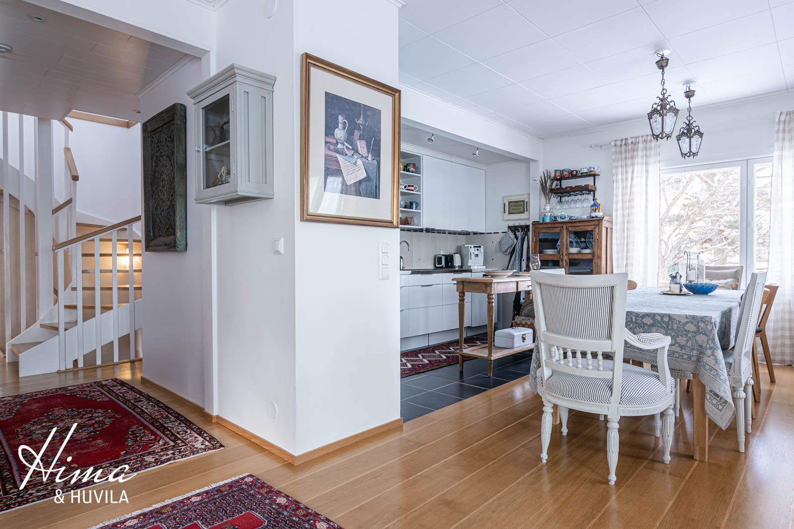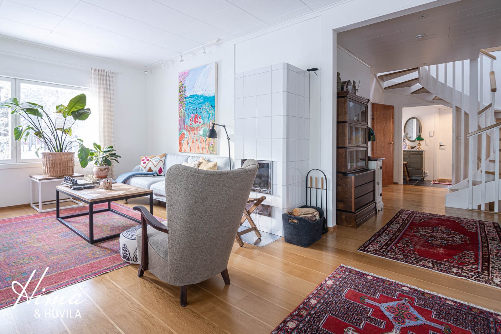 Maalämpö, aurinkopaneelit, koko talossa vesikiertoinen lattialämmitys, varaava takka |